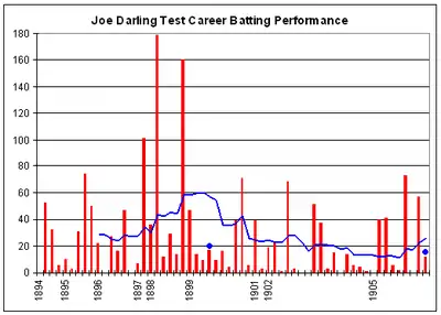 The 1905 tour was Darling's last Test cricket foray, as he claimed that continuing to tour was unfair to his wife.[4] He retired from first-class cricket during the 1907–08 season.[26] In his first-class career, Darling made 10635 runs, including 19 centuries at an average of 34.52.[35] In club cricket in Adelaide, Joe scored heavily. He averaged 144 for East Torrens Cricket Club in 1899–1900, 98.66 for Adelaide Cricket Club in 1896–97 and 86.20 for Sturt Cricket Club in 1904–05.[4] He continued to make runs in Tasmanian club cricket right through middle age. In 1921, he made 100 runs in an hour, including 29 in one eight-ball over playing for Claremont Cricket Club. At age 52, he made 133 not out during a successful run chase where his team, Break-o'-Day, made 6/219 in 90 minutes.[4]