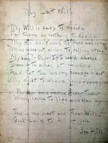 Hill's handwritten last will and testament was uncovered in the first decade of the 21st century by archivist Michael Nash of the Tamiment Library and Robert F. Wagner Archives of New York University.[31] Found in a box under a desk at the New York City headquarters of the Communist Party USA during a transfer of CPUSA archival materials to NYU, the document began with a couplet: "My will is easy to decide / For I have nothing to divide."[31]
