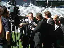 Hockey regularly appeared on the Seven Network's morning program Sunrise in the "Big Guns of Politics" section debating the Opposition Leader, Kevin Rudd, drawing 20,000-30,000 additional viewers who would tune in specifically for that segment,[27] until the arrangement was mutually terminated on 16 April 2007 following controversy over plans to stage a pre-dawn Anzac Day service in Vietnam.[28][29] Hockey credits this show for introducing him to an audience who had no interest in politics.[15]: 141–142