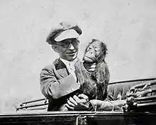 Around 1915, an animal trainer named Curley Stecker began taking care of Joe Martin.[40] According to Frank Buck, Joe Martin was cross-fostered by the Steckers: "He was taken into Curley's house to be raised...[and] grew up with the Stecker son." Curley is sometimes credited with "discovering" Joe Martin;[33] they worked as a team for the next eight years.[41] Stecker's family would sometimes appear alongside Joe Martin in films.[42][43][44][45] The Stecker family rented a house across the road[22][46][47] from the studio zoo, the zoo having been created in part as a "point of interest" at Universal City.[48] The keepers were responsible for introducing the animals to visiting dignitaries;[49][50] one such visit was made by Bishop Hanna of San Francisco in 1915.[51] Later, one of Joe Martin's directors wrote of the visit: "A famous old prelate came out to Universal City to see Joe. Joe listened while the old gentleman commented on the wonders of nature. 'You wouldn't catch a monkey taking a drink of vile liquor,' he observed. Joe reached in the hip pocket of his little pantaloons and came out with a pint of liquor, which he offered to the bishop with fine courtesy."[52]