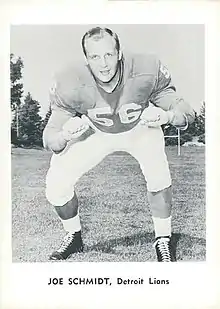 Joseph Paul Schmidt (born January 19, 1932) is an American former professional football player and coach. He played as a linebacker in the National Football League (NFL) for the Detroit Lions for 13 years from 1953 to 1965. He won two NFL championships with the Lions (1953 and 1957), and, between 1954 and 1963, he played in ten consecutive Pro Bowl games and was selected each year as a first-team All-Pro player. He was also voted by his fellow NFL players as the NFL's most valuable defensive player in 1960 and 1963, named to the NFL 1950s All-Decade Team, and inducted into the Pro Football Hall of Fame in 1973.