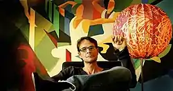 ![]() Johan Nissen relaxing in his home in front of a wall sized painting by Thomas Warming | |