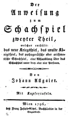 Johann Baptist Allgaier (June 19, 1763, Schussenried – January 3, 1823, Vienna) was a German-Austrian chess master and theoretician. He was also the author of the first chess handbook in German – Neue theoretisch-praktische Anweisung zum Schachspiel (Vienna 1795–96).[1]