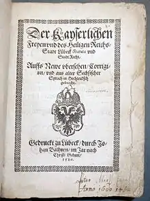 His most famous, but also most disparaged, work was an insufficiently revised High German version of the Lübeck law, done on assignment from the Lübeck Council from Mayor Johann Lüdinghusen, Syndikus Calixtus Schein, and Councilman Gottschalk von Stiten: Der Kayserlichen Freyen und des Heiligen Reichs-Stadt Lübeck Statuta und Stadt Recht. Auffs Newe vbersehen / Corrigiret / und aus alter sechsischer Sprach in Hochteudsch gebracht. Gedruckt zu Lübeck / durch Johann Balhorn / im Jar nach Christi Geburt / 1586.. Since the persons responsible did not name themselves on the title page, and there only the reference to the printer, the published edition was quoted accordingly. From this developed the phrase "Improved by Johann Balhorn" (Verbessert durch Johann Balhorn), which has been known since 1644, or, more simply, the term "verballhornen", with the meaning of "mess something up with the intention of correcting it",[4] to "disimprove."[3]