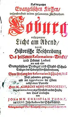 Thomae was born on 5 April 1668 at the house of his maternal grandfather, in Heldburg, Duchy of Saxe-Gotha-Altenburg. His father was Stephan Thomae,[1] the Lutheran pastor of Wiesenfeld bei Coburg and later of Neuhaus (now Neuhaus-Schierschnitz) and Sonnefeld. His mother was Cordula Buchenröder, the daughter of a Church Superintendent Michael Buchenröder.[2] Privately educated, Thomae came to Coburg in late May 1679 to join the Primary Class at the city's Collegiate School. In 1682, he was admitted to the Great Princely [Hochfürstliche] Gymnasium, also in Coburg, and graduated in 1686. From 1688 he studied at the University of Jena. After graduation, he worked as a teacher. In 1697, he was appointed as the Rector for the parish of Neustadt bei Coburg. Three years later, on 9 June 1700, he married Margaretha Dorothea Eyring (1675 – after 1715), the daughter of Johann Andreas Eyring,[3] the Lutheran pastor of Fechheim, and his wife, Anna Ursula Brechtold. With her, Thomae had five children, two boys and three girls.[4] In 1722 (ins XXVI. Jahr Rectore der Schul daselbst[5] [“in his 26th year as the Rector of the School”]) he published in Coburg his history of the Reformation of the Duchy of Coburg. He died on 19 March 1724, in Neustadt bei Coburg.