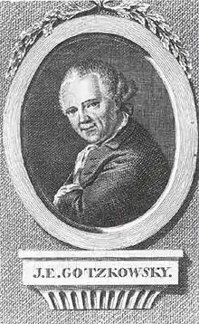 Gotzkowsky was born in Konitz (Chojnice) in Royal Prussia, Polish–Lithuanian Commonwealth and descended from an impoverished family of Polish nobility. Both his parents died when he was five years old as a result of the plague, which broke out after the Great Northern War. Gotzkowsky grew up with relatives in Dresden, who neglected his education. As a 14-year-old he went to Berlin to live with his brother and to apprentice in business with Adrian Sprögel till 1730. When Sprögel's business burned down, he joined his brother in the haberdashery.[1][2] He established him in his jewel and trinket shop and he quickly acquired customers in the highest circles; Sophia Dorothea of Hanover was his best client. After he met with Frederick the Great Gotzkowsky became royal warrant. In 1741 he became a Freemason. In 1745, he married the daughter of the rich lace maker Blume. Gotzkowsky persuaded his father-in-law to start a velvet factory, which he managed and inherited in the year after. Then Frederick II commissioned Gotzkowsky to promote the silk trade to compete with France; since 1752/3 Gotzkowsky ran a silk factory employing 1,500 persons. Frederick also followed his recommendations in the field of toll levies and import restrictions.