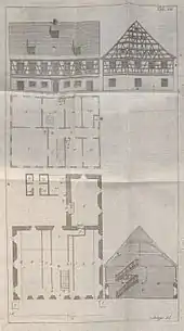 The 1773 textbook on husbandry, entitled Lehrbuch für die Land- und Haußwirthe in der pragmatischen Geschichte der gesamten Land- und Haußwirthschafft des Hohenlohe Schillingsfürstischen Amtes Kupferzell, described the agriculture and other customs in the Hohenlohe region of the Germany.[11] Mayer among others presented plans for a new farm house, the so-called "Pfarrer-Mayer-Häuser", in which the rural residential area and the barn were under one roof. The barn, located on the ground floor, would heat the living room on the first floor.