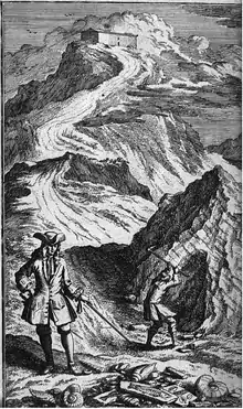 In the second category are his Itinera alpina tria[1] (made in 1702–04), which was published in London in 1708, and dedicated to the Royal Society, while the plates illustrating it were executed at the expense of various fellows of the society, including the president, Sir Isaac Newton (whose imprimatur appears on the title-page), Sir Hans Sloane, Dean Aldrich, Humfrey Wanley, etc. The text is written in Latin, as is that of the definitive work describing his travels (with which is incorporated the 1708 volume) that appeared in 1723 at Leiden, in four quarto volumes, under the title of Itinera per Helvetiae alpinas regiones facta annis 1702–11.