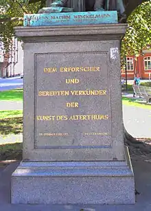 Winckelmann was homosexual, and open homoeroticism formed his writings on aesthetics. In 1752, he mentioned the "lust" which could be experienced with the "divine monarch" (i.e. Frederick the Great) in Potsdam in a similar way as in "Athens and Sparta" and which he could enjoy so immensely that he would never again be allowed to.[10][11] His homosexuality was recognized by his contemporaries, such as Goethe.[12] In 1768, at the age of 50, he was murdered by a fellow guest at his hotel, for reasons that remain unclear.