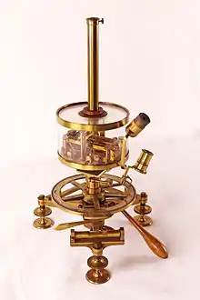 Johann Michael Ekling was the posthumous son of the army surgeon Joseph Ekling. His mother was Anna Maria Euphrosina Ekling née Spitzbarth. He was born in the suburb of Wieden (then a part of Vienna). At the age of 32 he married Theresia Schwarz, with whom he had five sons and a daughter. In the years to follow, he cooperated closely with mathematics and physics professors Andreas von Baumgartner (German Wikipedia)[2] and Andreas von Ettingshausen of the University of Vienna. He produced artificial magnets on behalf of Baumgartner[3] and one of the first photographic apparatuses in Austria (1839)[4] following instructions by Ettingshausen,[5] who had worked with Daguerre. By 1844 he is referred to as a "university mechanic".[6] An announcement in a paper describes his range of products as follows: "[Ekling] makes all sorts of mathematical and physical instruments and apparatuses, air pumps with glass barrel chambers, travel barometers, goniometers,[7] chemical and mineralogical apparatuses".[8] His multiplicator was used for the analysis of mineral waters among other things and praised for its sensitivity.[9] Ekling was granted patents for induction machines, cameras and improvements to the Bain telegraph, which were taken over by the Austrian railway. Ekling’s last invention was a "Galvanic Induction Machine for Medical Purposes".[10]