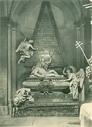 After Joseph's death on 17 April 1711, Wratislaw, as a minister, became a member of the council advising his widow as Regent, Eleonore-Magdalena, which brought about the withdrawal of Joseph's brother Karl from Catalonia. When Karl was crowned as Emperor Charles VI he confirmed Wratislaw in his offices, who remained from then on in Vienna, where, badly overweight, he was believed to have died on 21 December 1712 of dropsy. His remains were interred for a year in Vienna's Totenkapelle before being moved to the Church of St. James the Great in Staré Město, Prague in 1714, following the completion of an elaborate sarcophagus by the famous Baroque architect Fischer von Erlach.[1][2][3]