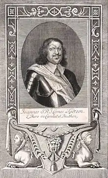 Johann baron of Götzen[Note 1] was born in 1599, to a noble, Lüneburg Lutheran family. At the outbreak of the Thirty Years' War he joined the army of the Electoral Palatinate, serving in the forces of Ernst von Mansfeld and the neutral Dutch Republic. Following the Mansfeld's defeat at the Battle of Dessau Bridge, he defected to the Imperialists. In 1626, he took part in the occupation of the Duchy of Pomerania, receiving the command of the island of Rügen two years later. In 1628, he participated in the unsuccessful siege of Stralsund, which had refused to adhere to the Capitulation of Franzburg. The 1630, Swedish intervention in the Thirty Years' War led to the loss of Pomerania, Götzen's forces remained in the area for a short period of time, engaging in the act of Brandschatzung (extorting money and resources from the local population under the threat of violence). He appears to have left the army following the dismissal of Imperial Albrecht von Wallenstein, on the same year.[2][3]