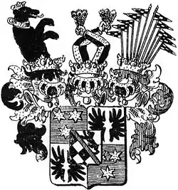 This situation changed when the new Prince of Anhalt-Dessau, Leopold II Maximilian, began the procedures to the ennoblement of the family of his deceased older brother from 1748.[2] After clarifying the financial questions (Prince Leopold II and his siblings shared the cost of 22,000 Reichsthalers) the formal application was made to the Reichshofrat (Imperial Council) in Vienna. On 19 September 1749, Francis I, Holy Roman Emperor gave his consent and Johanna Sophia Herre and her nine children became the Imperial Counts and Countesses of Anhalt (German: Reichsgrafen und -gräfinnen von Anhalt). Associated with this was the right to use their own coat of arms, but the exclusion of the children from the Anhalt succession was confirmed.