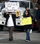 The protest regrouped downtown at the intersection of 14th and Broadway, blocking motor vehicle traffic.[65] Some of the protesters lay face down in the intersection, in a symbolic act of solidarity with Grant, who was killed in the same position.[63] Others shouted at police and chanted in unison. Others carried signs that read, "Your idea of justice?" and "Jail Killer Cops"[63] and lit candles in remembrance of Grant.