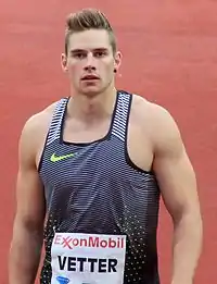 Johannes Vetter (German: [joˈhanəs ˈfɛtɐ]; born 26 March 1993) is a German athlete who competes in the javelin throw. He won gold at the 2017 World Championships in Athletics. His personal best of 97.76 m is the German record, and ranks him second on the overall list. Vetter currently trains under Boris Obergföll and is a member of LG Offenburg's track and field squad.[2] He was previously with SV Saar 05 Saarbrücken and Dresdner SC.[3]