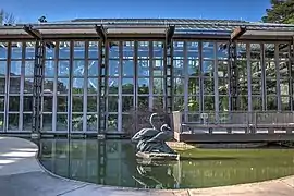 The garden-and-greenhouse occupied 5 acres (2.0 ha) which contained both exotic and native plants. Greenhouse sections included the main conservatory, a tropical conservatory, a sculpture garden with the "Dove of Peace" carrara marble sculpture, a fern grotto, a sub-Mediterranean conservatory and an outdoor garden. "Partners in Time" is a 22-foot indoor waterfall, over which 350 gallons of water flowed per minute.[4] Indoor displays were changed eight times each year and bronze sculptures added to the visitor's experience.[5]