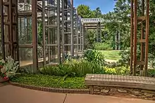 The building was constructed using 7,000 glass blocks and 300 tons of fieldstone from Tennessee.[4] The outdoor and indoor gardens were separated by 26 folding glass doors, 1,600 pounds each and 24' tall. They were designed to be easily closed or opened by staff members. The building's steel structure was reddish-brown in color, a product named Cor-Ten. "Cor" stands for corrosion resistant and "Ten" stands for tensile strength. This steel alloy oxidizes to a predictable depth which makes it perfect for outdoor construction. Cason Callaway was on the board for the U.S. Steel Corporation, which developed Cor-Ten in 1940.[5]