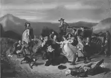 On 3 May 1679, a group of nine Covenanters, led by David Hackston and his brother-in-law, John Balfour of Kinloch, were waiting at Magus Muir, hoping to ambush the Sheriff of Cupar.[10] A Sharp appointee, the Sheriff was prominent in persecuting Covenanters but apparently heard about the proposed ambush and stayed home.[11] Learning Sharp's coach was on the road, they intercepted it instead; Sharp was stabbed several times, in front of his daughter Isabella, before being killed by a shot to the chest. One of the group, James Russell, claimed he told Sharp he "...declared before the Lord that it was no particular interest, nor yet for any wrong that he had done to him, but because he had betrayed the church as Judas, and had wrung his hands, these 18 or 19 years in the blood of the saints, but especially at Pentland..."[12]