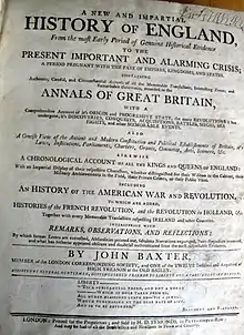 In February 1796 Baxter circulated proposals for A new and impartial history of England written by him and ‘assisted by several gentlemen, distinguished friends to liberty and a Parliamentary reform’. The work was dedicated to the London Corresponding Society, 'to the numerous Political Societies in Great-Britain and to the people at large.[14] It was published in weekly parts during 1796 and early 1797.[15] This work was intended as an antidote to David Hume's history, to provide Englishmen with 'a perpetual memento of their rights and privileges.' Baxter's motives for the publication are set out in his preface. 'We are the more convinced of the propriety and absolute necessity of such an undertaking at this time, because we have seen persons in authority making considerable incroachments on the liberties of the people, and under false or frivolous accusations shutting men up in prison, and attempting their lives, because they had virtue enough to oppose their arbitrary measures.'[16]