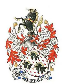 In 1952, as John Brooke-Little was entering the world of heraldry as a Gold Staff Officer, he began exploring the origins of his own arms. His family had been using the arms Azure, six lioncels rampant gules,[19] but some research proved that the Brooke-Littles had no right to these arms. John worked to apply for a grant on behalf of his father. When asked for input, his father noted that the lions previously used were improper and that he thought unicorns would be a good replacement. Red gouttes (droplets) alluded to the family's former holding of the Manor of Slaughterford. The arms were granted to Raymond Brooke-Little on 5 March 1952. John quartered these arms with those of his mother, Constance Egan. The whole shield of arms is blazoned Quarterly: I and IV, argent, goutté de sang three unicorns' heads erased sable armed and crined or langued azure (Brooke-Little); II and III, azure, two dolphins haurient and addorsed or, the eyes gules, between four shamrocks slipped or.[20] The crest is blazoned a demi-unicorn rampant erased sable, armed, crined and unguled or, langued azure and collared gobony or and gules, with a chain or reflexed over the back and attached with a ring or. At the same time, the motto of Recte Aut Nil (meaning 'correctly or not at all') was granted, as well as John Brooke-Little's well-used badge, blazoned a triquetra or interlaced by an annulet argent.
