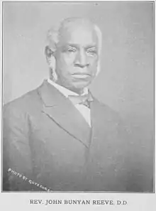 John Bunyan Reeve was born October 29, 1831, in Mattituck, New York. He attended district schools and worked on a farm as a young man. His parents were Presbyterians and his mother pushed him to become a minister. As a young man he was a member of the Shiloh Presbyterian church under Rev. James W.C. Pennington. He worked as a teacher for a few months at New Tower, Long Island when, in 1853, he enrolled at the New York Central College at McGrawsville, New York, in a preparatory course for the seminary. He finished that program in June 1858 and entered the Union Theological Seminary in September 1858.[1] Reeve was Union's first black student.[2] As a student, he was supported financially and spiritually by William E. Dodge and Asa D. Smith. In April 1861 he graduated and became a minister at the Third Presbytery in New York City.[1]