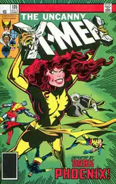 Byrne joined Claremont beginning with X-Men #108 (Dec. 1977), which was later renamed The Uncanny X-Men with issue #114.[24] Their work together, along with inker Terry Austin, on such classic story arcs as "Proteus", "Dark Phoenix Saga", and "Days of Future Past" would make them both fan favorites.[25] Byrne insisted that the title keep its Canadian character, Wolverine, and contributed a series of story elements to justify Wolverine's presence which eventually made the character among the most popular in Marvel's publishing history. With issue #114, Byrne began co-plotting the series as well as penciling. Claremont recounted that "at that point in time John and I were, in a very real sense, true collaborators on the book. It was with very few exceptions, difficult, for me, anyway, to tell in the actual gestation of the book where one of us left off and the other began – because it involved one of us coming up with an idea and bouncing it off the other ..."[26] The "Dark Phoenix Saga" in 1980 is one of the most notable stories in the title's history.[27][28] Comics writers and historians Roy Thomas and Peter Sanderson observed that "'The Dark Phoenix Saga' is to Claremont and Byrne what the 'Galactus Trilogy' is to Stan Lee and Jack Kirby. It is a landmark in Marvel history, showcasing its creators' work at the height of their abilities."[29] Byrne has repeatedly compared his working relationship with Claremont to Gilbert and Sullivan, and has said that they were "almost constantly at war over who the characters were."[30] Byrne created the characters Alpha Flight,[31] Proteus,[32] and Kitty Pryde/Shadowcat[33][34] during his run on The X-Men. A new Brotherhood of Evil Mutants, led by Mystique, was introduced in the "Days of Future Past" storyline (#141–142, Jan.-Feb. 1981) in which a time-travelling Kitty Pryde tried to avert a dystopian future caused by the Brotherhood assassinating Presidential candidate Senator Robert Kelly.[35] Byrne plotted the story wanting to depict the Sentinels as a genuine threat to the existence of the mutant race.[36] Byrne left The X-Men with #143 (March 1981). During his tenure on the series, The X-Men was promoted from a bimonthly to a monthly publication schedule as sales steadily increased—a trend that continued long after Byrne left.[37]