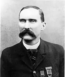 His service with the 61st led him to participate in the Overland Campaign, the Siege of Petersburg, Sheridan's Shanandoah Valley Campaign, and the Appommattox Campaign. He was wounded twice. The first was at the Battle of Cedar Craak dring Sheridan's Valley Campaignm. The second time was at the Breakthrough at Petersburg for which he was awarded the Medal of Honor.[4] Carrying the state flag in thecolor guard, he was in the vanguard of the 61st as it led the VI Corps attack on 2 April 1865. At the first volley from the Rebel lines, the regimental Color Sergeant fell wounded. Matthews grabbed the regimental colors and carried both. The defenders' fire stalled the attack, and the regiment fell back behind some breastworks forward of their lines. MAJ Robert L. Orr took the state flag from Matthews and began yelling and wavit to rally the attack. Matthews joined him and the two led the renewed advance into the Confederate positions that they captured. Matthews later wrote that "I had the honor to pick up a flag, carry it off the field, and, a few moments later, to plant it on the enemy's works for which service my colonel promoted me on the field to color-sergeant, and recommended me for a medal."[5] He was one of five members of the 61st that earned the medal for their actions that day.[6][2] The resultant victory combined with Sheridan's victory at Five Forks and Miles' victory at Sutherland's Station were breakthroughs that forced the evacuation of Petersburg and the Rebel retreat that ended with the surrender at Appomattox Court House.[2][7]