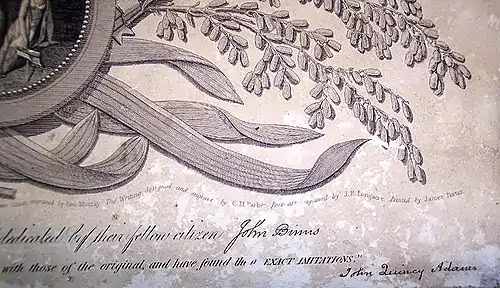 Duignan obtained the John Binns facsimile of an ornamental Declaration of Independence, published in 1819, and gave it to Moss to be photo-engraved. Duignan deleted John Binns' name from the original dedication which appears at the bottom of the document and inserted his own name. He also deleted Binns' notice of copyright: "Entered according to Act of Congress the 4th of November 1818 by John Binns of the State of Pennsylvania." Thus, Duignan falsely filed for a copyright in his own name and the copyright was granted.
