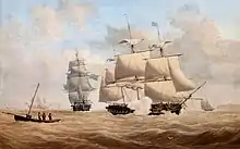 Manby's sketches of a whaling trip to Greenland were used by William Joy to paint scenes of the Greenland Whale Fishery, that were later included in Manby's Journal of a Voyage to Greenland (1822).[23] An early attempt to paint in watercolours was their depiction of the yacht HMS Royal Sovereign in 1822, as it passed Yarmouth on its passage to Scotland, George IV being aboard.[24][note 4] They depicted the Lord High Admiral, the Duke of Clarence, visiting his son on board HMS Euryalus at Spithead, which helped to bring them recognition within naval circles.[24]