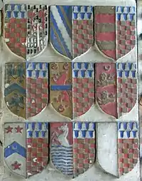 He married Gertrude Courtenay, a daughter of Sir William III Courtenay (1477–1535) "The Great",[4] of Powderham, Devon, MP for Devon in 1529, thrice Sheriff of Devon, in 1522, 1525-6, 1533-4, an Esquire of the Body to King Henry VIII, whom he accompanied to the Field of the Cloth of Gold.[5] He was 6th in descent from Hugh Courtenay, 2nd Earl of Devon (died 1377), and his own grandson William Courtenay (1527–1557) of Powderham became himself de jure 2nd Earl of Devon under the 1553 creation of that title. The arms of Courtenay quartered with Redvers appear amongst the many heraldic escutcheons shown on Chichester's monument in Pilton Church. He had by her seven sons and nine daughters,[6] who married into many of the leading gentry families of Devonshire, two of them marrying children of first cousins of Lady Jane Grey (1536/1537-1554), The Queen of Nine Days.[7] The marriages of his children are represented heraldically on a panel on his monument in Pilton Church.