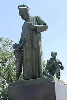 Drumgoole was a hero of the newsboys who thronged the area when Park Row was the headquarters of New York City's major newspapers, including The New York Times, and was considered an unofficial patron saint of the homeless, orphans, and the less fortunate. In 1894, a statue was erected in Drumgoole's honor at Lafayette Street, the site of the Manhattan Mission.[8] It was later moved to Mount Loretto in 1920. The Mission of the Immaculate Virgin has been on its current site in the Pleasant Plains section of Staten Island since 1883. Mount Loretto, an orphanage for boys and later girls as well, was run by the mission for many years.[2] The Mission of the Immaculate Virgin continues to provide a variety of social services.