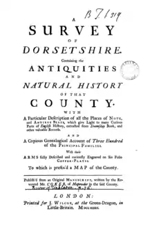 A Survey of Dorsetshire (1732). The earliest county history of Dorset, incorrectly attributed to Coker.
