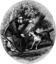 John Howie in the Scots Worthies tells about the dog: "During his travels abroad he was frequently delivered out of very great dangers, by the kind interposition of a gracious Providence: an instance of which we have while he was in Italy. Being obliged to flee out of that country, on account of his regard for the Reformation, in order to avoid being apprehended, he was obliged to lurk in obscure places in the day-time, and travel over night. By this means any little money he had was soon exhausted, and being in the extremity of want, a dog brought a purse to him with some gold in it, by which he was supported until he escaped the danger of being taken."[29] John Hamilton argued "...a black dog gave to him by the way a purse of gold. The colour of the dog may declare whether it was sent by a good spirit or not; for the Holy Spirit descended upon Christ in the likeness of a white dove."[27]