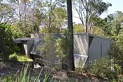 The first, considered Dalton's ‘Anonymous Houses’, encompassed the design of a series of modest homes in Brisbane's (then) semi-rural Western suburbs between 1956 and 1961. These ‘anonymous’ houses were distinguished by their ‘unobtrusive simplicity’,[12] in lieu of any strong ‘stylistic’ presence.[13] These early houses designed by Dalton retain visual similarities with the architects under whom John Dalton had worked, most notably, the renowned practice of Eddie Hayes & Cam Scott. This was most evident in the specification of construction and finishes in these early houses. Whilst relatively non-specific, the form of these houses often emphasised the horizontality of the building, often with continuous runs of windows/glazed sliding walls, and expressed soffit beams and lines of eaves.[14]