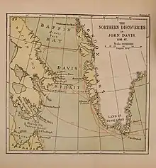 He began pitching a voyage in search of the Northwest Passage to the queen's secretary Francis Walsingham in 1583.[4] Two years later, in 1585, the secretary relented and funded the expedition, which traced Frobisher's route to Greenland's east coast, around Cape Farewell, and west towards Baffin Island.[2] In 1586 he returned to the Arctic with four ships, two of which were sent to Greenland's iceberg-calving eastern shore; the other two penetrated the strait which came to bear his name as far as 67°N before being blocked by the Arctic ice cap. Sunshine attempted (and failed) to circumnavigate the island from the east.[5] The initially amiable approach Davis adopted to the Inuit – bringing musicians and having the crew dance and play with them[4] – changed after they stole one of his anchors; they were likely irate at having been interrupted during one of their religious ceremonies. Inuit also attacked his ships in Hamilton Inlet (Labrador).[2] A third expedition in 1587 reached 72°12'N and Disko Island before unfavorable winds forced it back. On his return, Davis charted the Davis Inlet in the coast of Labrador. The log of this trip remained a textbook model for later captains for centuries.[2]