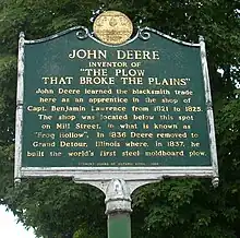 John Deere settled in Grand Detour, Illinois. At the time, Deere had no difficulty finding work due to a lack of blacksmiths working in the area.[9] Deere found that cast-iron plows were not working very well in the tough prairie soil of Illinois and remembered the needles he had previously polished by running them through sand as he grew up in his father's tailor shop in Rutland.[9] Deere came to the conclusion that a plow made out of highly polished steel and a correctly shaped moldboard (the self-scouring steel plow) would be better able to handle the soil conditions of the prairie, especially its sticky clay.[10]