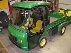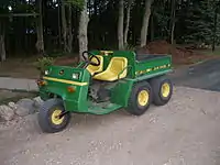 The John Deere Gator is a family of small all-terrain utility vehicles produced by the John Deere Corporation. Gators typically feature a box bed, similar in function to a pickup truck. The bed can also be installed as an electric dump body. The John Deere Gator has been made in a variety of configurations, with either four, five or six wheels.[1] The Gator line of vehicles are designed to serve on farms, worksites, and ranches, rather than as a pure off-road vehicle. However, it is possible to order with specific off-road features. Introduced in 1992, the vehicle replaced the five-wheeled John Deere AMT line introduced in 1987.[2]