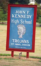 John F. Kennedy High School is a public school located in Mt. Angel, Oregon, United States, as part of the Mt. Angel School District.[4] The school was originally Mt. Angel Preparatory School run by the Benedictine monks of Mount Angel Abbey, and was founded in 1887.[5] The Benedicitnes ran the school until 1964, when they turned its administration over to St. Mary's Catholic Church, located in Mt. Angel. The parish ran the school for five years until closing it in 1969.[6] It was reopened one year later as John F. Kennedy High School, and remains so today.