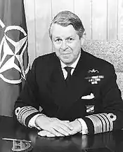 In 1972, with his promotion to commodore, Fieldhouse took command of the Standing Naval Force Atlantic.[3] He then moved to the Ministry of Defence, initially as Deputy Director of Naval Warfare and then, from November 1973, as Director of Naval Warfare.[1] He was appointed Flag Officer, Second Flotilla in December 1974,[1] promoted to rear admiral on 7 January 1975,[6] and became Flag Officer Submarines as well as NATO Commander Submarines Eastern Atlantic in November 1976.[1] He was promoted to vice admiral on 1 April 1978,[7] and became Controller of the Navy in January 1979.[3] He was appointed a Knight Commander of the Order of the Bath in 1980 New Year Honours.[8]