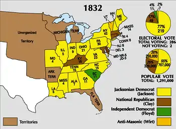 The presidential election of 1832 was approaching, and Floyd was torn: He wanted to see Vice President Calhoun as the presidential candidate but wondered if he should first be proposed as the vice presidential candidate for the second term. He felt Calhoun had a better chance to beat Jackson than Clay, and he wrote to Calhoun in April 1831 to know his opinion: "Under all these views I really do not know which course to take; whether to announce you a candidate for the presidency and take the hazard of war, or wait the fate of Clay. We would be glad to know your opinion about these things."[32] Floyd, along with Tazewell and John Tyler, were considered the leaders of the Virginians that had become disaffected with Jackson and had turned to Calhoun.[33] They felt that Jackson had repudiated "virtue and ability as well as Old Republican tenets."[33] According to historian Stephen Oates, "In Floyd's opinion, the federal government under "King Andrew" had usurped power left and right, thus allowing the majority to run roughshod over the minority."[31]