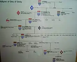 Sir John Grey KG (c. 1387 – 27 August 1439), English nobleman and soldier, of Ruthin, Denbighshire, Wales, Badmondisfield (in Wickhambrook), Suffolk, Great Gaddesden, Hertfordshire, etc., second but eldest surviving son and heir apparent of Sir Reginald Grey, 3rd Baron Grey de Ruthyn by his 1st wife, Margaret Roos.[1] He was also Captain of Gournay. He was Lord Lieutenant of Ireland in 1427-28, acting mainly through the Bishop of Meath as his Deputy.