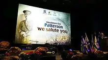According to Patterson's grandson, Alan Patterson, one of his final wishes was that both he and his wife eventually be interred in Israel, ideally with or close to the men he commanded during the First World War.[25] Alan Patterson, the Jewish American Society for Historic Preservation, Canadian representative Todd Young, Beit HaGedudim (the museum of the Jewish Legion), and the moshav (village) of Avihayil (represented by Ezekiel Sivak) began a coordinated effort to honour this request in 2010. With the assistance and support of the Israeli government and Prime Minister Benjamin Netanyahu, on 4 December 2014, the remains of Patterson and his wife, were re-interred in the Avihayil cemetery where some of the men he commanded are buried. Attending the ceremony were Prime Minister Netanyahu, members of his family, military and cabinet members of the Israeli government, the British Ambassador, the Irish Ambassador, Alan Patterson, Jerry Klinger of the Jewish American Society for Historic Preservation, Ezekiel Sivak of Avihayil, representatives and descendent family members of the Jewish Legion, Christians supporters of Israel, 350 guests and numerous other dignitaries.[26] Netanyahu referred to Patterson as "the godfather of the Israeli army" and "a great friend of our people, a great champion of Zionism and a great believer in the Jewish State and the Jewish people... I feel it is an obligation of our people, our State and mine personally to fulfil his testimony".[27][28][29][30]
