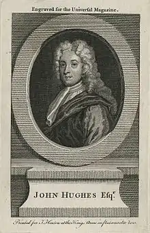 Hughes was born in Marlborough, Wiltshire, the elder son of John Hughes, clerk in the Hand-in-Hand Fire Office, Snow Hill, London, and his wife Anne Burges, daughter of Isaac Burges of Wiltshire. He was educated in London, receiving the rudiments of learning in private schools.[1] Emerging from education with an interest in all the arts, Hughes had to earn his living as a secretary at the Board of Ordnance. His poetry often dealt with patriotic themes and was judiciously dedicated to political lords but did not obtain for him a sinecure until late in his life. In fact his literary ability was mediocre, but he retained the friendship of such leading Augustan writers as Joseph Addison, Richard Steele and Alexander Pope. He was in the company of all these as a contributor to The Spectator, and also wrote essays for several other periodicals of the day. In one on "The Inventory of a Beau" he describes a picture of himself as a young man about town wearing "a well trimmed blue suit, with scarlet stockings rolled above the knee, a large white peruke, and a flute half an ell long".[2] His portrait by Godfrey Kneller some two decades later is more restrained, except for the length of the wig.