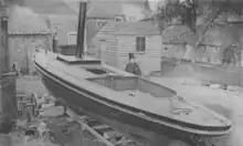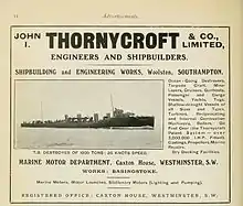 The first ship built by Thornycrofts for the Royal Navy at the Woolston Yard was the Tribal-class destroyer HMS Tartar. Up to the start of World War I, the yard built 37 destroyers for the Royal Navy and several more for other navies. During the war, the yard made 26 destroyers, 3 submarines and a large number of smaller craft for the Royal Navy.[8] Notable among the smaller craft were the Coastal Motor Boats (built at Hampton – see below), based on a design by John Thornycroft (the elder) who continued working with hull designs at his home on the Isle of Wight until his death in 1928, taking out his last patent in 1924.[9] His daughter, naval architect Blanche Thornycroft worked alongside him (and after his death) testing models, calculating and recording results.[10]