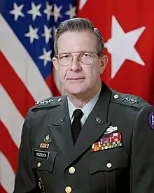 John J. Yeosock was born in Wilkes-Barre, Pennsylvania,[1] on March 18, 1937, and grew up in Plains Township. He studied at the Valley Forge Military Academy where he graduated as valedictorian. Unable to get into West Point due to bad eyesight, Yeosock joined the Reserve Officers' Training Corps at Pennsylvania State University, graduating in 1959 with a B.S. degree in industrial engineering. He later earned an M.S. degree in operations research and systems analysis from the Naval Postgraduate School in 1969.[2][3] As an infantry officer Yeosock served in the Vietnam War. During the 1980s, Yeosock was the head of an U.S. military team sent to help modernize the Saudi Arabian National Guard.