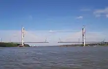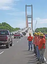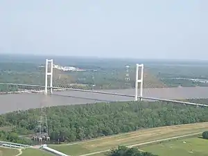 The John James Audubon Bridge, completed and opened in May 2011, is a Lower Mississippi River crossing between Pointe Coupee and West Feliciana parishes in south central Louisiana. The bridge has the second longest cable-stayed span (distance between towers) in the Western Hemisphere at 1,583 ft (482 m), after Mexico's Baluarte Bridge with a 1,706 ft (520 m) span, and has a total length of 12,883 ft (3,927 m)—nearly three-and-a-half times longer than the Baluarte Bridge's 3,688 ft (1,124 m) total length.[1][6] The Audubon Bridge replaces the ferry between the communities of New Roads and St. Francisville. The bridge also serves as the only bridge structure on the Mississippi River between Natchez, Mississippi and Baton Rouge, Louisiana (approximately 90 river miles). The bridge conveys Louisiana Highway 10, which is in a concurrence there with the Zachary Taylor Parkway.
