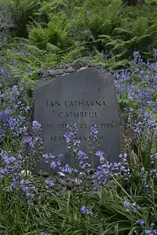 He died on 25 April 1996 whilst on holiday at Villa San Girolamo in Fiesole in Italy,[4][40] and in accordance with his wishes was "buried where he fell". In 2006, however, Cambell's body was repatriated and reburied in a birch wood planted by himself near St. Columba's Roman Catholic chapel on Canna. In 2008, a headstone was taken from the garden at Taynish House on the Inverneill estate, brought to Canna, and set in a small cairn, with the inscription: