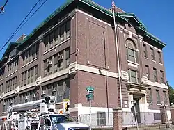 Designed by Henry deCourcy Richards, this historic structure was built between 1909 and 1910, and is a three-story, five-bay by three-bay, brick building that sits on a raised basement. Designed in the Colonial Revival style, it has a three-story, rear brick addition that was built in 1922. It features a pedimented cornice, brick parapet, projecting central section, and a two-story arched opening above the main entrance.[2] The school was named for Chief Justice John Marshall.
