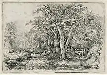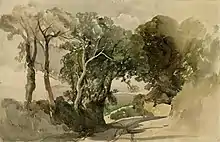 His etchings required a different technique from his watercolours: their delicacy and intricacy are said by the author Geoffrey Searle to resemble the work of John Crome.[11] In contrast to his watercolours, his etchings are mostly depictions of wooded landscapes, ranging in tone from those that are heavily inked, to others with a light, silvery touch and delicate lines. None of them depict human figures.[63] A set was published separately in 1852 as Nine Etchings by John Middleton, now held at the British Museum and Norwich Castle.[22][64] He also painted in oils, but little has been written of his oil paintings, whose subject matter was similar to his watercolours and which displayed a similar immediacy of execution.[29]