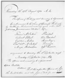 Milton was born in Halifax County, North Carolina. John Milton's family in North Carolina was constituted by migration of English families, including the Milton family, from Virginia from the early to mid 1700s. English laws passed that "touched off a boom in North Carolina that lasted from 1730 to the American Revolution."[2] The most recent research demonstrates with a preponderance of evidence that Milton's father, also John, migrated to the North Carolina Coastal Plain with cousins, e.g., Robert Milton (1696-1759; died in Orange County, NC).[3][4][5][6] Thus, John Milton of Halifax, North Carolina is likely a descendant of the scrivener Richard Milton, who immigrated on the ship "Supply," 1621/22, to Barclay/Jamestown.[7][8] The Carolinian John Milton joined the Continental Army as an ensign in the 1st Georgia Regiment, Jan. 7, 1776; was promoted 1st lieutenant, and was taken prisoner at Fort Howe, Georgia, in February 1777, with Lieut. William Caldwell, on the surrender of that place, held as a hostage and imprisoned in the castle at St. Augustine, Florida, until November 1777. He was promoted captain, Sept. 15, 1777, and on his release returned to the army and served until the end of the war, retiring Sept. 15, 1782. Milton was admitted as an original member of The Society of the Cincinnati in the state of Georgia, serving as the Georgia constituent society's first secretary from 1783 to 1786.[9][10] He engaged in planting after the war.